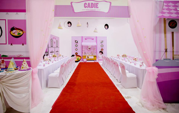 Tiệc sinh nhật được bố trí như một quán mì nhỏ và Mộc Trà là “bà chủ quán” siêu cute. Với màu hồng nổi bật, đáng yêu được sử dụng chủ đạo cho màn, backdrop, khu vực tiếp khách cũng như các nơ nhỏ trên ghế ngồi.