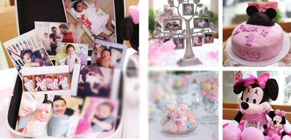 Bella nhà Phạm Quỳnh Anh được tổ chức tiệc sinh nhật theo chủ đề mà mình yêu thích – nhân vật chuột Mickey. Không gian tiệc màu hồng chủ đạo được trang trí với những chùm bóng bay, kẹo ngọt… Bàn decor trưng bày ảnh của bé từ khi mới sinh tới năm một tuổi, thay cho chủ nhân kể lại một cuộc hành trình