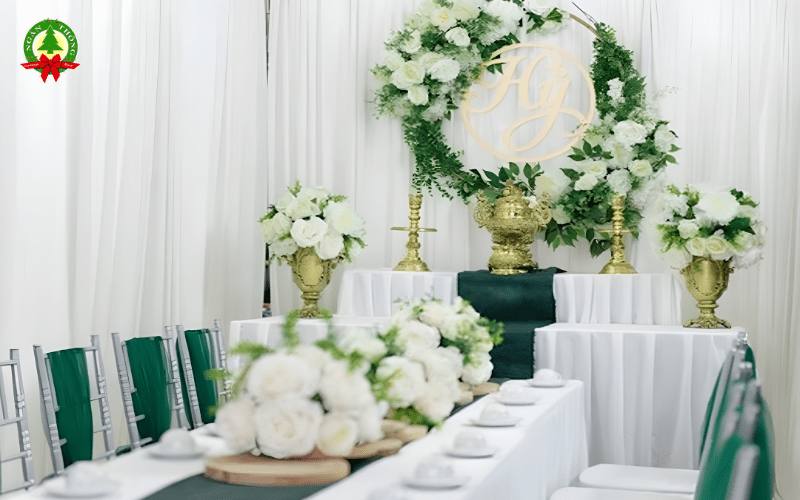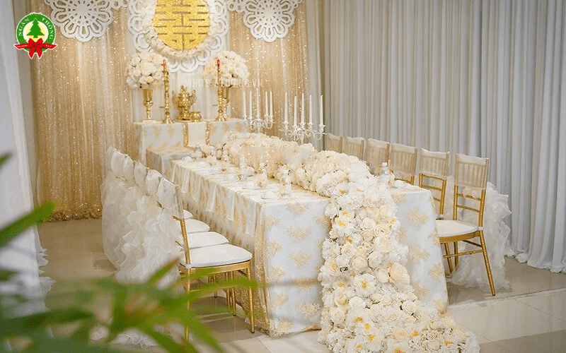 - Hoa trang trí: Thường là điểm nhấn chính, sử dụng các loại hoa tươi nhập khẩu như hoa hồng, cẩm tú cầu, baby’s breath với các gam màu pastel (hồng, trắng, kem, xanh mint).
