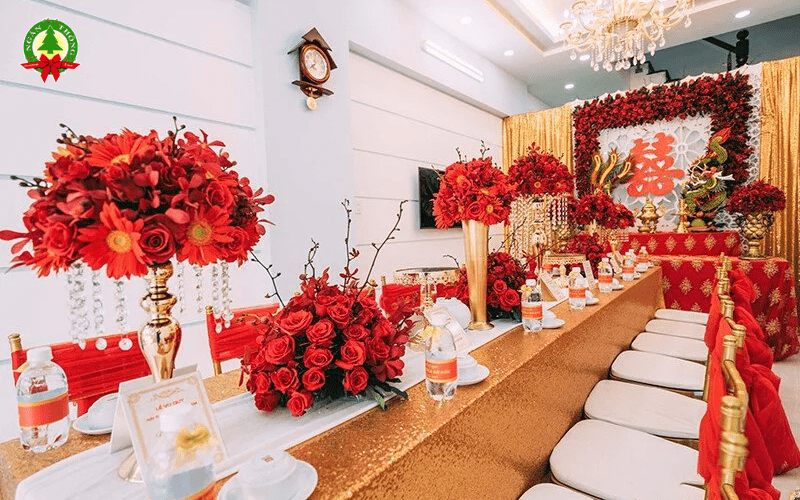 - Hoa tươi: Bao gồm 2 bình hoa lớn để bàn thờ, hoa để bàn hai họ, và các chi tiết hoa trang trí khác.