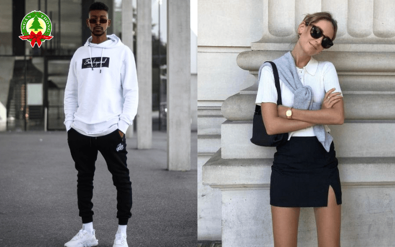 - Nam giới: Hoodie đen kết hợp quần jogger trắng tạo phong cách năng động.