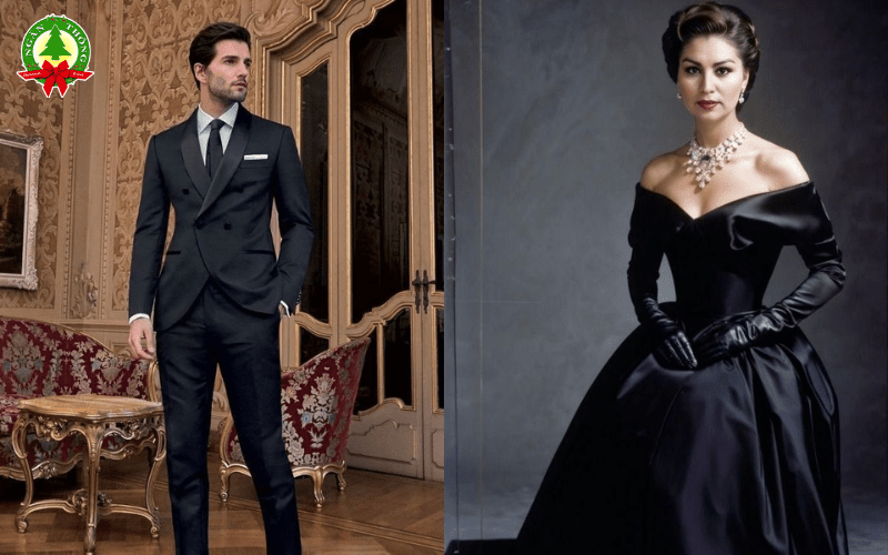 - Nữ giới: Váy dạ hội dài chấm đất màu đen hoặc trắng, kết hợp trang sức tinh xảo và clutch cầm tay.