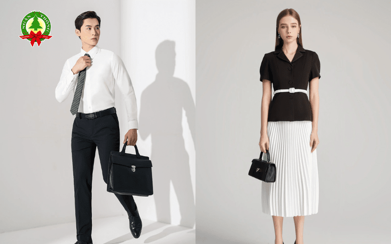 - Nữ giới: Áo sơ mi/blouse trắng kết hợp quần tây ống suông hoặc chân váy bút chì đen. Ngoài ra, váy liền thân tối giản màu đen cùng giày cao gót cũng rất phù hợp.